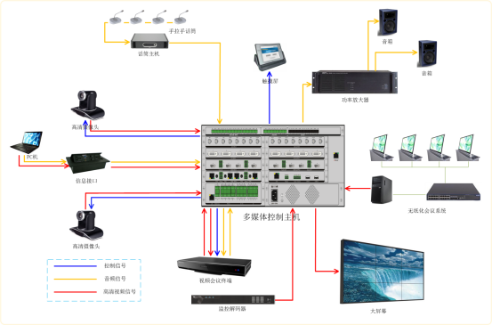 2、 多媒体控制系统:采用视通科技生产的多媒体会议室核心设备----多媒体控制主机,集高清混合矩阵、数字音频处理器、集中控制主机、高清录播服务器于一体。