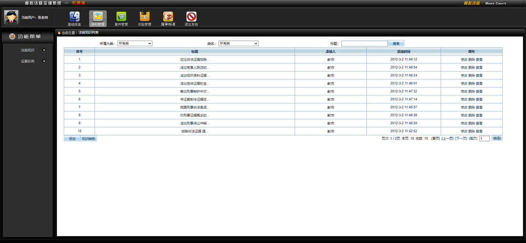 系统应用软件包含了具有核心管理功能的书记员应用客户端,以及为法官和当事人提供笔录和电子证据共享的相应客户端。另一核心应用系统是模拟教学实训系统,用于法学院师生开展模拟审判实训使用,实现案件模拟实训、案件审理角色模拟、审理流程指引、实践案例培训等。
