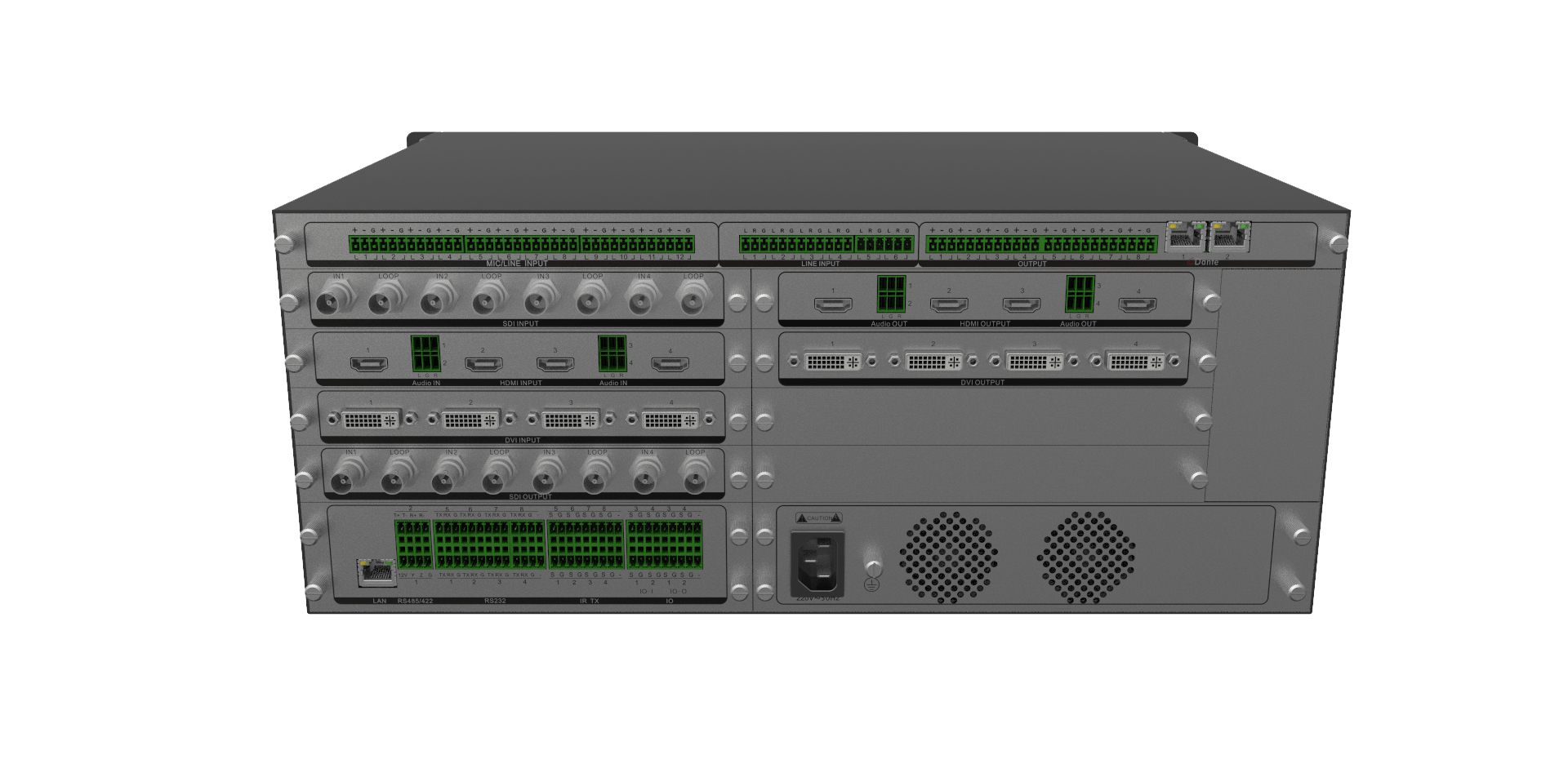 提供HDMI/DVI/SDI/HDBaseT/VGA/光纤多种板卡选配,具有字幕/EDID/HDCP/单图层拼接/多画面合成等功能
